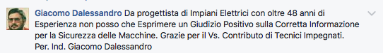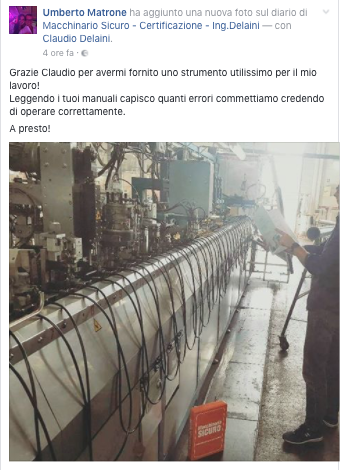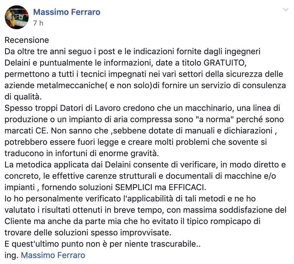 a prova dell’efficienza dimostrata dagli ingegneri Delaini della DEDO risorse nel trovare le migliori soluzioni di sicurezza nel contesto produttivo l’abbiamo avuta durante una visita dell’ASL la quale non solo ci ha fatto i complimenti per il lavoro svolto ma ha voluto la copia di un fascicolo tecnico come esempio a dimostrazione degli obiettivi da raggiungere per la messa in sicurezza di impianti e macchinari. Una cosa fondamentale è che durante il lavoro svolto con la DEDO risorse oltre alla sistemazione degli impianti e dei macchinari il continuo confronto con gli ingegneri Delaini ha creato cultura e ha contribuito a sensibilizzarci facendoci cambiare la mentalità produttiva ottenendo come risultato una maggiore attenzione degli operatori verso la loro sicurezza.
